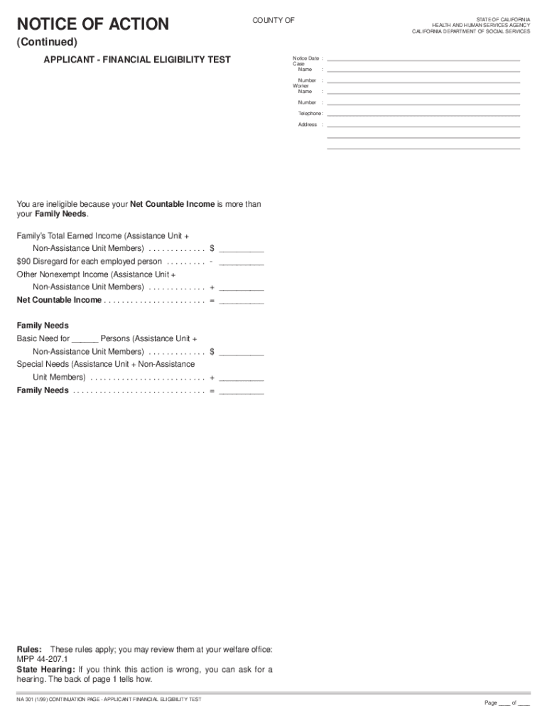 NOTICE OF ACTIONCOUNTY STATE OF CALIFORNIA HEALTH AND HUMAN SERVICES AGENCY CALIFORNIA DEPARTMENT OF SOCIAL SERVICES(Continued) APPLICANT FINANCIAL ELIGIBILITY TESTNotice Date : Case Name : Number