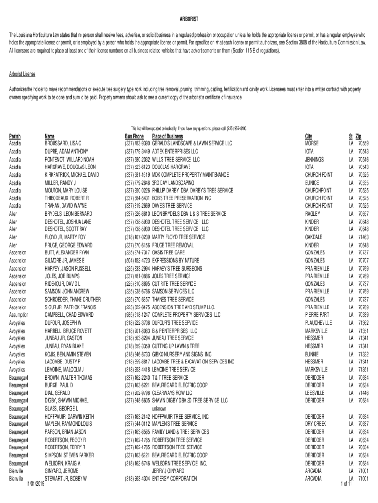 ARBORIST The Louisiana Horticulture Law states that no person shall receive fees, advertise, or solicit business in a regulated profession or occupation unless he holds the appropriate license or