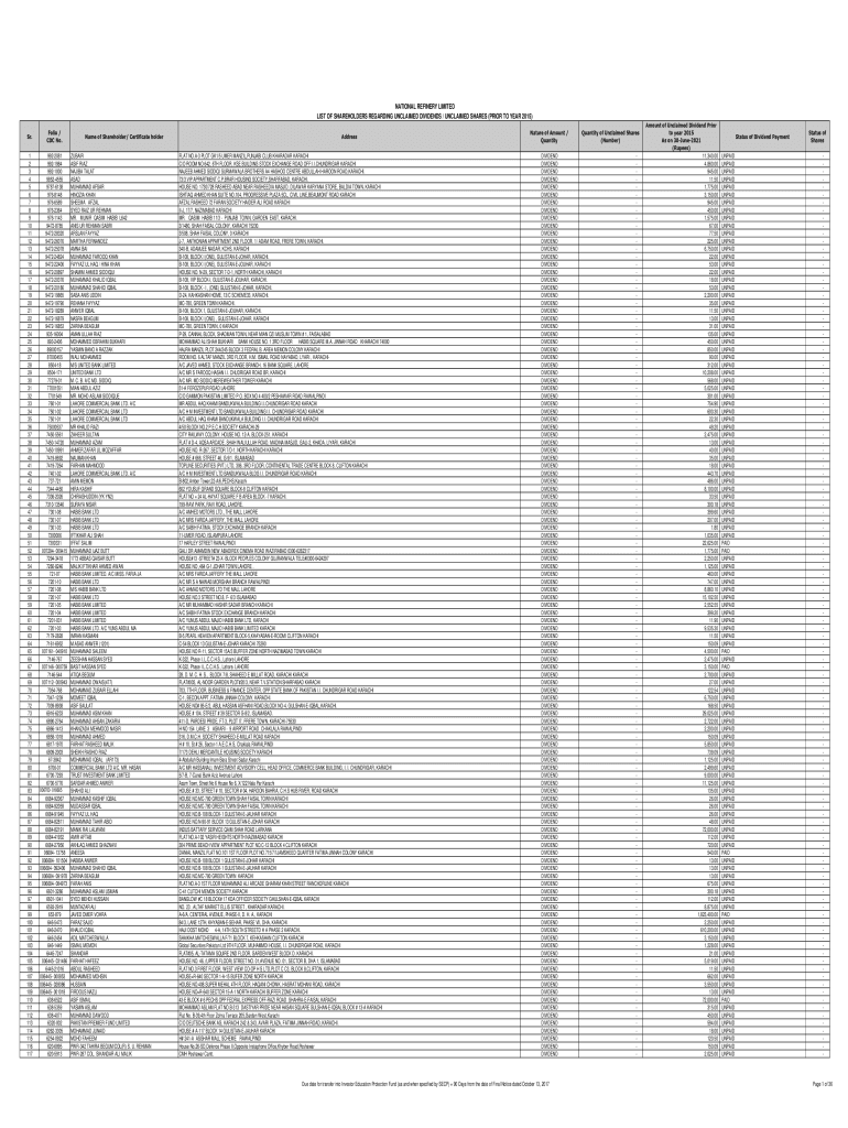 NATIONAL REFINERY LIMITED LIST OF SHAREHOLDERS REGARDING UNCLAIMED DIVIDENDS / UNCLAIMED SHARES (PRIOR TO YEAR 2015) Sr. 1 2 3 4 5 6 7 8 9 10 11 12 13 14 15 16 17 18 19 20 21 22 23 24 25 26 27 28