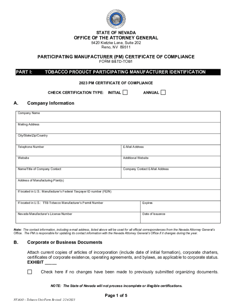 STATE OF NEVADAOFFICE OF THE ATTORNEY GENERAL 5420 Intake Lane, Suite 202 Reno, NV 89511PARTICIPATING MANUFACTURER (PM) CERTIFICATE OF COMPLIANCE FORM B&TDTOB1PART I:TOBACCO PRODUCT PARTICIPATING