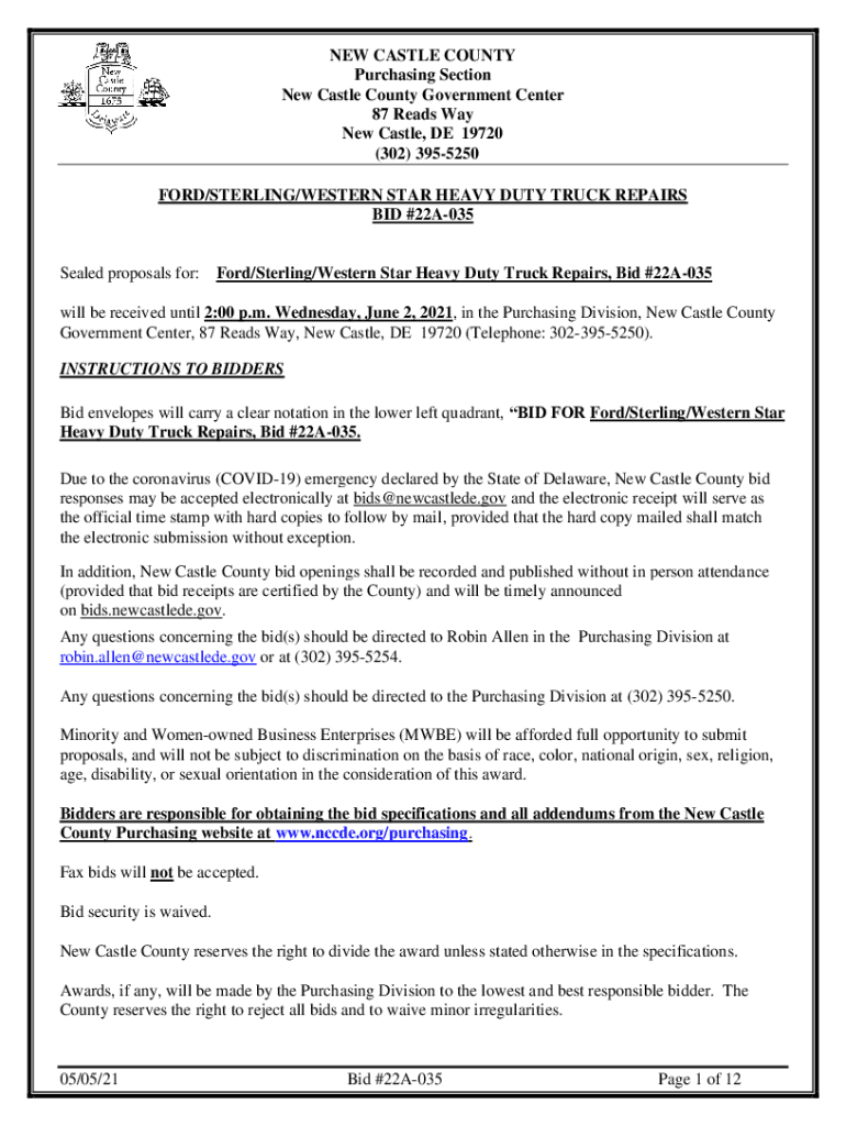 NEW CASTLE COUNTY Purchasing Section New Castle County Government Center 87 Reads Way New Castle, DE 19720 (302) 3955250 FORD/STERLING/WESTERN STAR HEAVY-DUTY TRUCK REPAIRS BID #22A035Sealed proposals