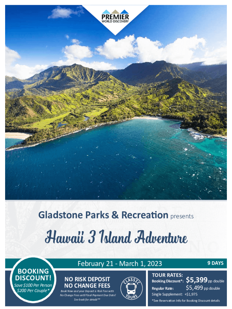 Gladstone Parks & Recreation presents Hawaii 3 Island Adventure BOOKING DISCOUNT! Save $100 Per Person $200 Per Couple×September 24, 2021, February 21 March 1, 2023, NO RISK DEPOSIT NO CHANGE Feedback