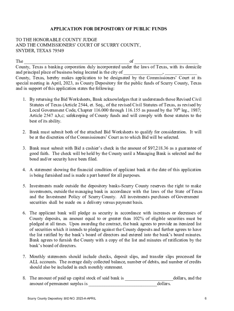 NOTICE TO BIDDERS OF SCURRY COUNTY\'S INTENTION TO RECEIVE BID PROPOSALS TO CONSIDER DEPOSITORY BANK. Notice is hereby given that Scurry County Commissioners\' Court will receive bids until 05:00