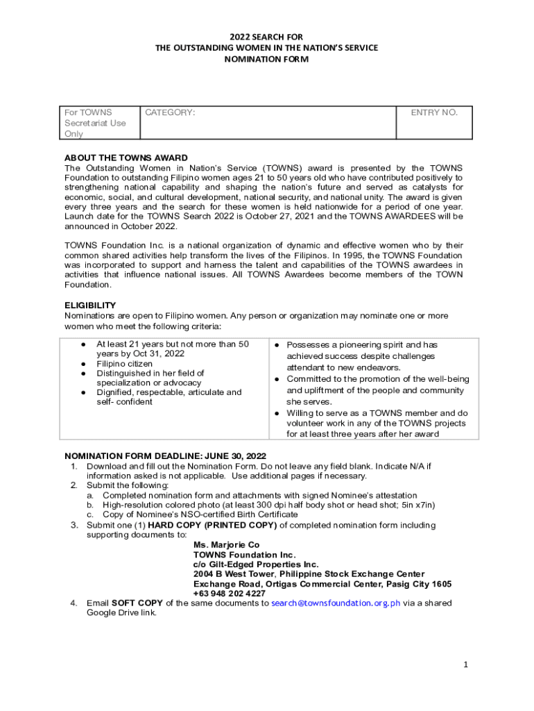 2022 SEARCH FOR THE OUTSTANDING WOMEN IN THE NATIONS SERVICE NOMINATION Former TOWNS Secretariat Use OnlyCATEGORY:ENTRY NO.ABOUT THE TOWNS AWARD The Outstanding Women in Nations Service (TOWNS) award
