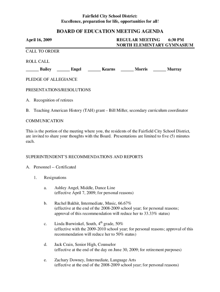 Excellence, preparation for life, opportunities for all!BOARD OF EDUCATION MEETING AGENDA