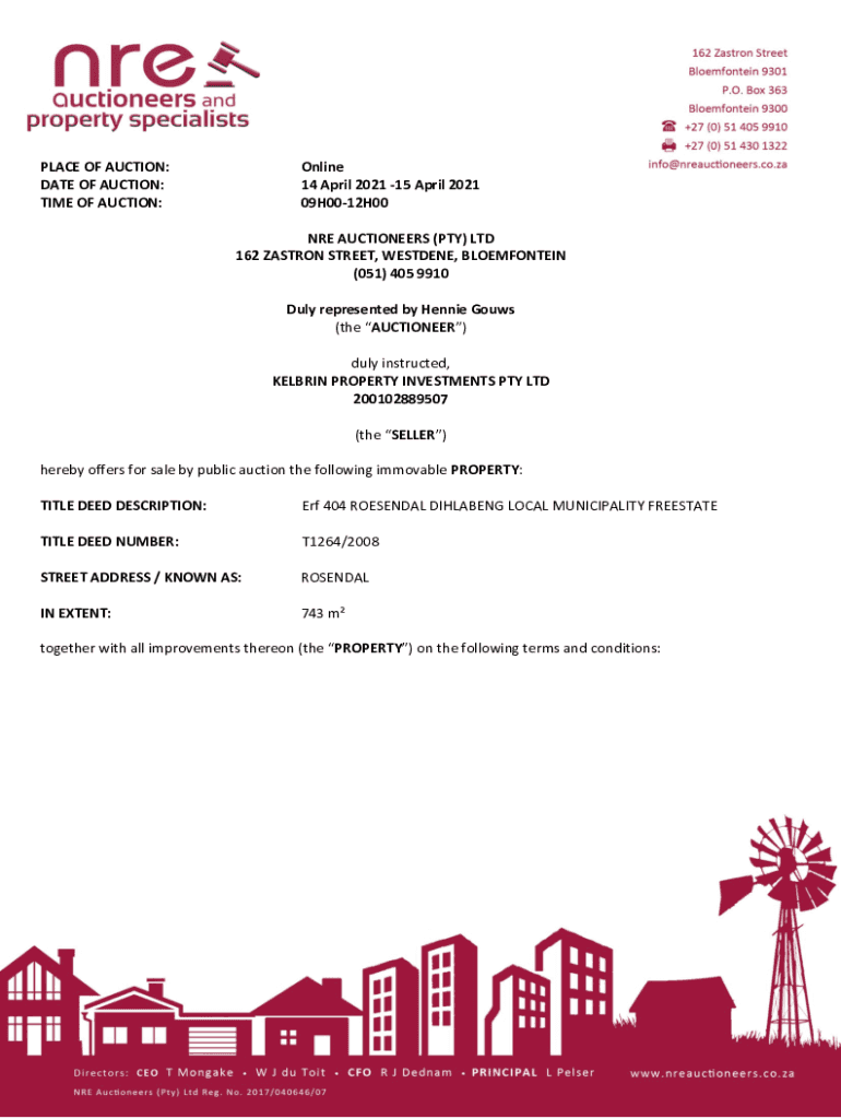 PLACE OF AUCTION: DATE OF AUCTION: TIME OF AUCTION:Online 14 April 2021 15 April 2021 09H0012H00 ARE AUCTIONEERS (PTY) LTD 162 PATRON STREET, WESTDALE, BLOEMFONTEIN (051) 405 9910 Duly represented