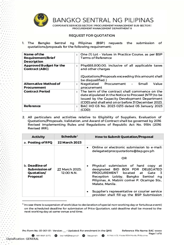 CORPORATE SERVICES SECTOR | PROCUREMENT MANAGEMENT SUBSECTION | PROCUREMENT MANAGEMENT DEPARTMENT REQUEST FOR QUOTATION 1. The Bangkok Central NG Filipinas (BSP) requests quotations/proposals for