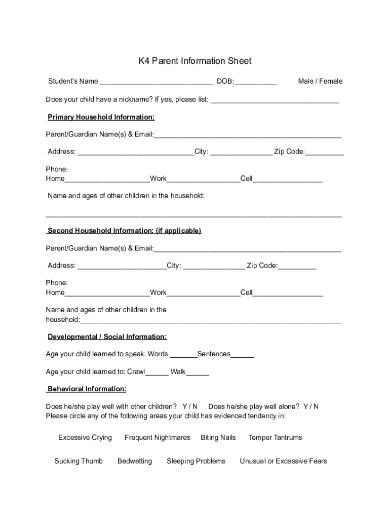 K4 Parent Information Sheet Students Name ___ DOB:___Male / Females your child have a nickname? If yes, please list: ___ Primary Household Information: Parent/Guardian Name(s) & Email:___ Address: