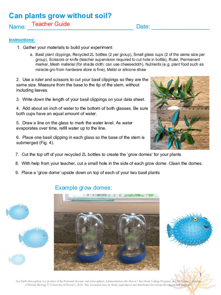 Can plants grow without soil? Teacher Guide Date: ___ Name: ___ Instructions: 1. Gather your materials to build your experiment: a. Basil plant clippings, Recycled 2L bottles (2 per group), Small