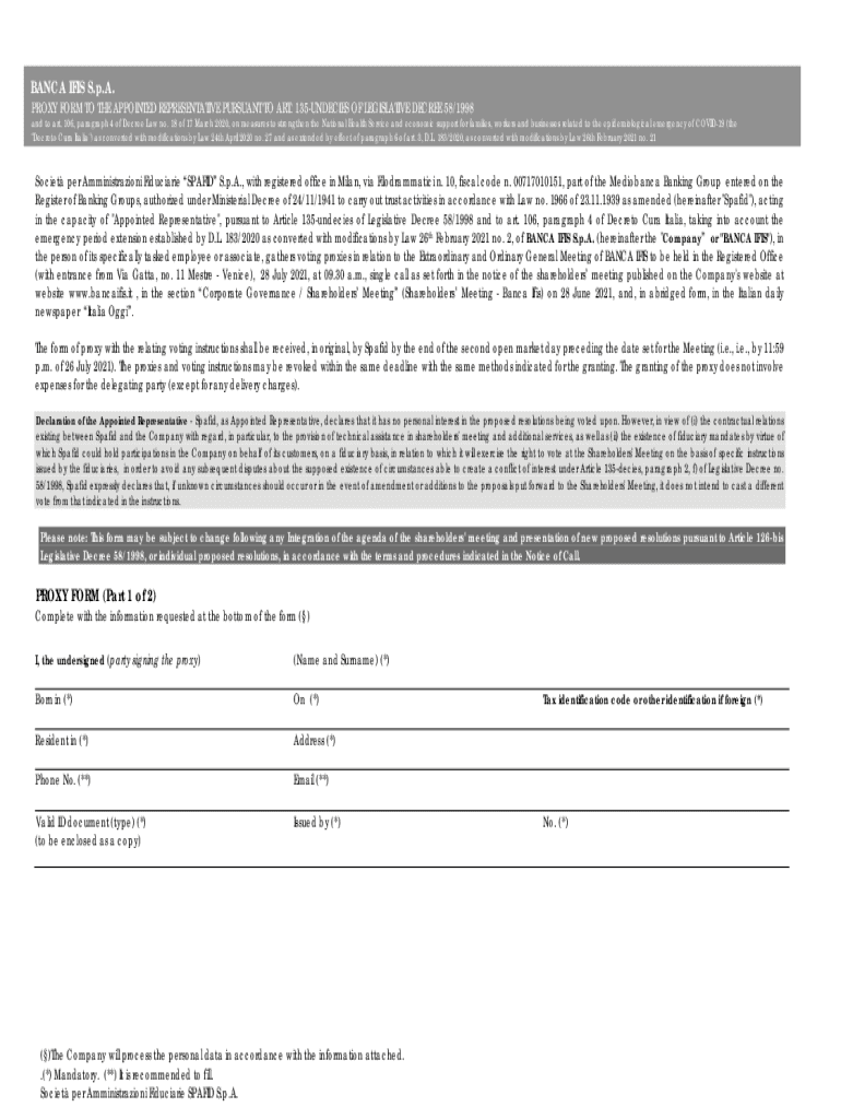 BIANCA IRIS S.p.A. PROXY FORM TO THE APPOINTED REPRESENTATIVE PURSUANT TO ART. 135UNDECIES OF LEGISLATIVE DECREE 58/1998 and to art. 106, paragraph 4 of Decree Law no. 18 of 17 March 2020, on measures