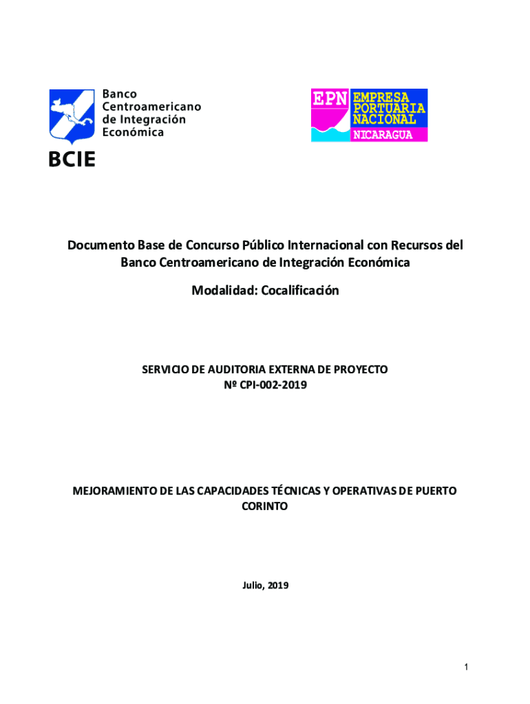 Document Base de Concurso Public International con Precursor Del Banco Centroamericano de Integracin Econ mica Modality: CocalificacinSERVICIO DE AUDITOR IA EXTERNAL DE PROJECT N CPI0022019MEJORAMIENTO