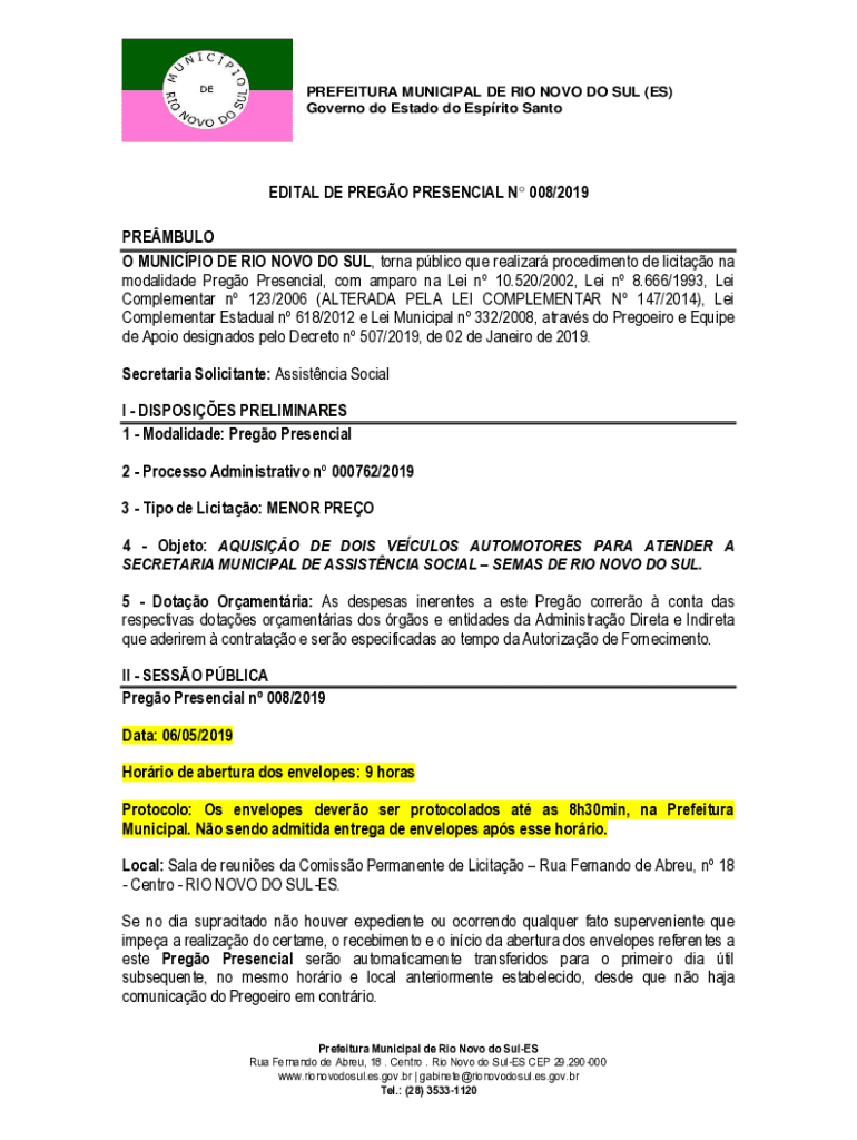O MUNICIPAL DE RIO NOVA DO SUB, torn public Que realizer procedimento de