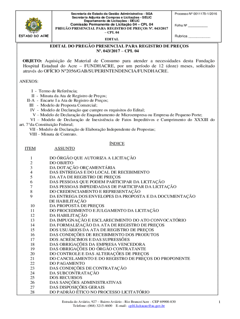 Secretariat de Estado the Gusto Administrative SGA Secretariat Ad junta DE Cameras e Lucites RELIC Department de Licitaes DELICESTADO DO ACREComisso Permanent de Licitao 04 CPL 04 PRESO PRESENCE PARA