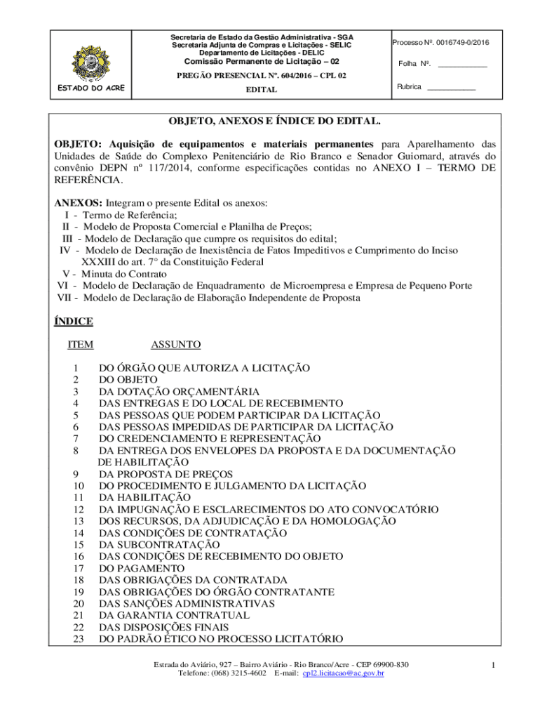 Secretariat de Estado the Gusto Administrative SGA Secretariat Ad junta DE Cameras e Lucites RELIC Department de Licitaes DELICComisso Permanent de Licitao 02Processo N. 00167490/2016 Fol ha N.___PRESO