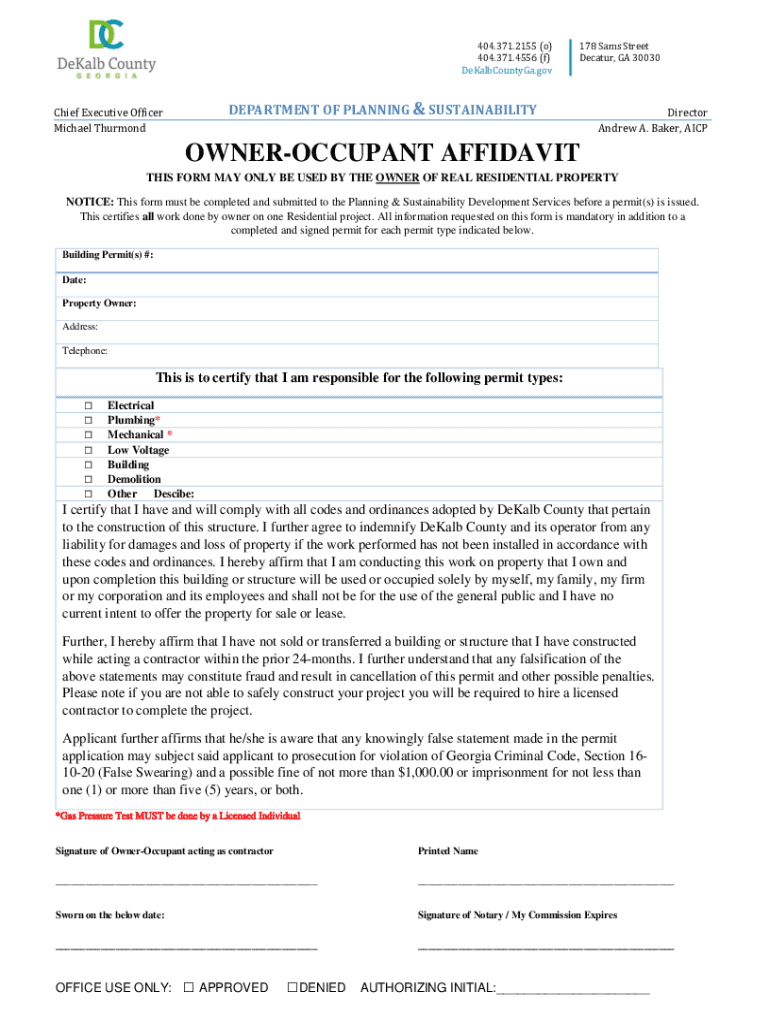 404.371.2155 (o) 404.371.4556 (f) DeKalbCountyGa.gov178 Sam's Street Decatur, GA 30030DEPARTMENT OF PLANNING & SUSTAINABILITYChief Executive Officer Michael ThurmondDirector Andrew A. Baker, AICPOWNEROCCUPANT