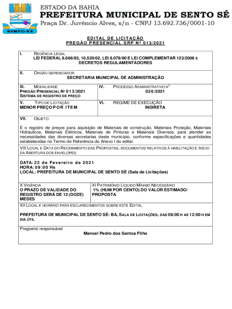 E D I T AL D E L I C I T A O P R E G O P R E S E N C I AL S R P N 0 1 3 / 2 0 2 1 I.REGALIA LEGAL LEI FEDERAL 8.666/93, 10.520/02, LEI 8.078/90 E LEI COMPLEMENTARY 123/2006 E SECRETS REGULAMENTADORESII.RGO