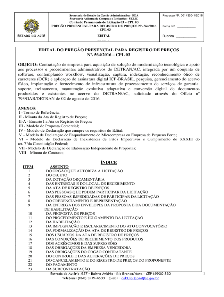 Secretariat de Estado the Gusto Administrative SGA Secretariat Ad junta DE Cameras e Lucites SELICESTADO DO Reprocess N. 00143651/2016Comisso Permanent de Licitao 03 CPL 03 PRESO PRESENCE PARA REGISTRY