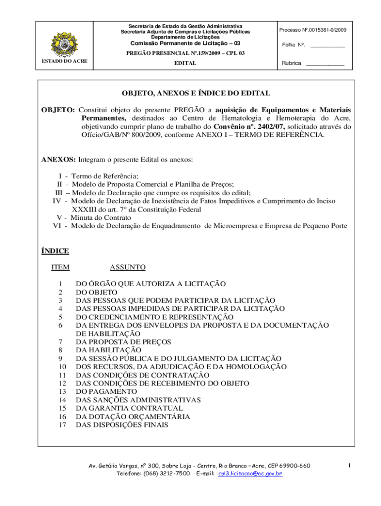 Secretariat de Estado the Gusto Administrative Secretariat Ad junta DE Cameras e Lucites Pelican Department de LicitaesComisso Permanent de Licitao 03Processo N.00153810/2009 Fol ha N.___PRESO PRESENCE