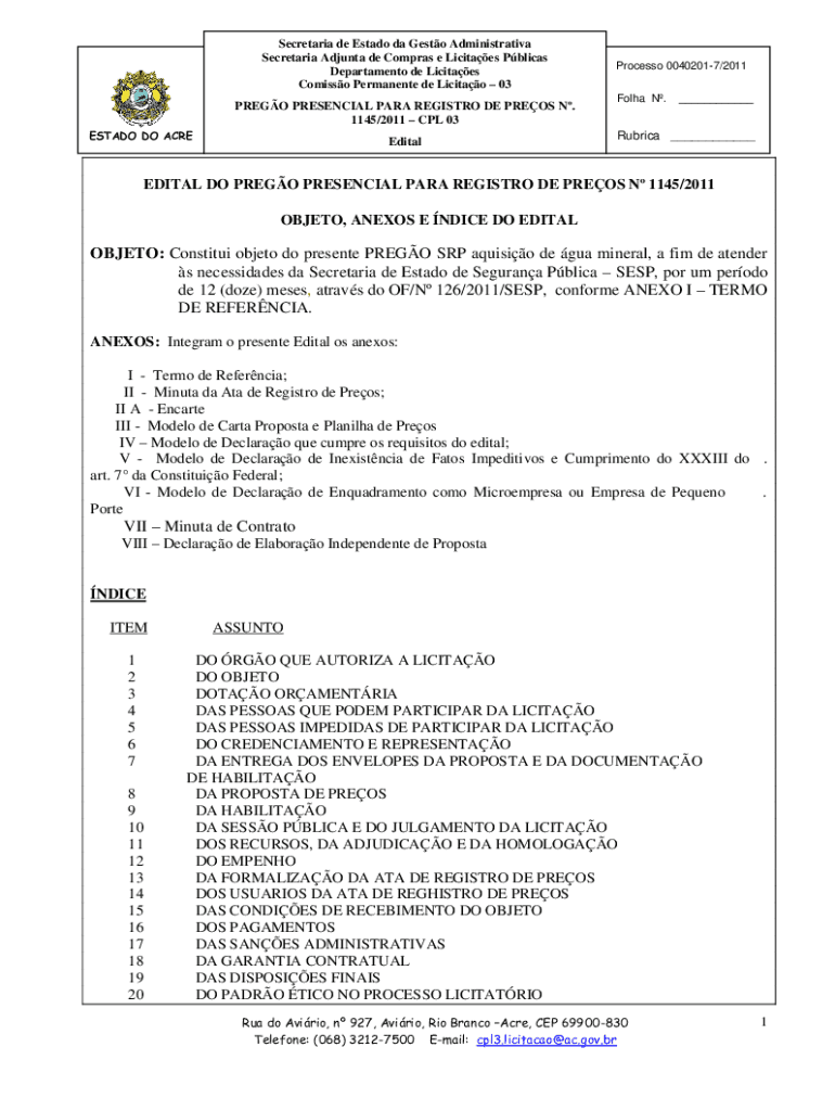 Secretariat de Estado the Gusto Administrative Secretariat Ad junta DE Cameras e Lucites Pelican Department de Licitaes Comics Permanent de Licitao 03 PRESO PRESENCE PARA REGISTRY DE PRESS N. 1145/2011