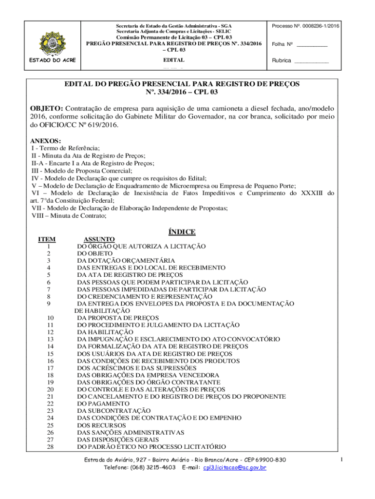 Obtenha o gratuito OBJETO: Contratao de empresa para aquisio de uma camioneta a diesel fechada, a...