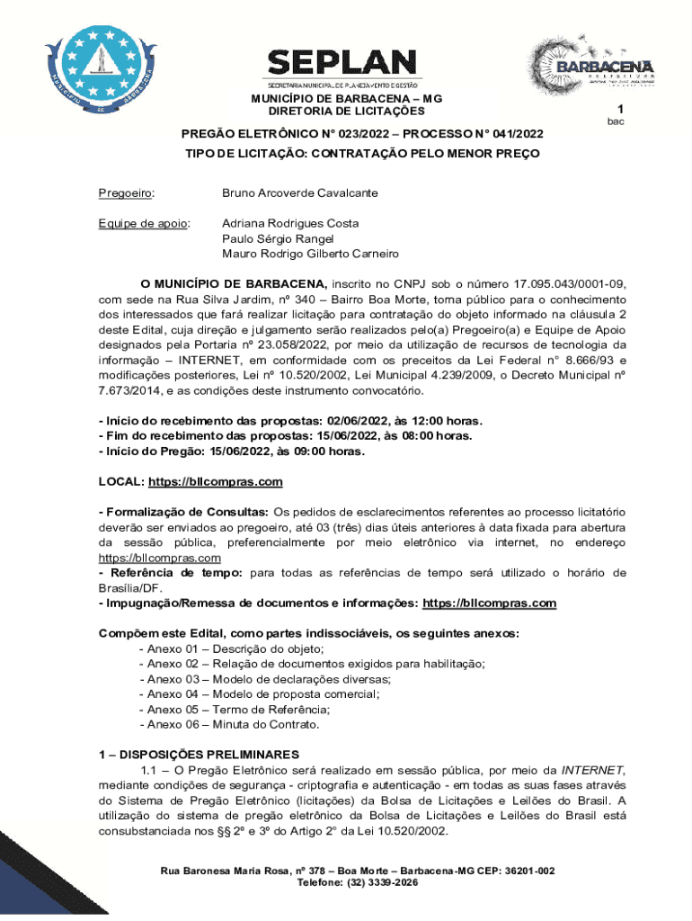 MUNICIPAL DE BARBACOA MG DIRECTORIAL DE LICITAES1 backrest ELECTRIC N 023/2022 PROCESS N 041/2022 TIP ODE LICIT AO: CONTRA TAO POLO MINOR PRO Preboard:Bruno Covered CavalcanteEquipe de April:Adriana