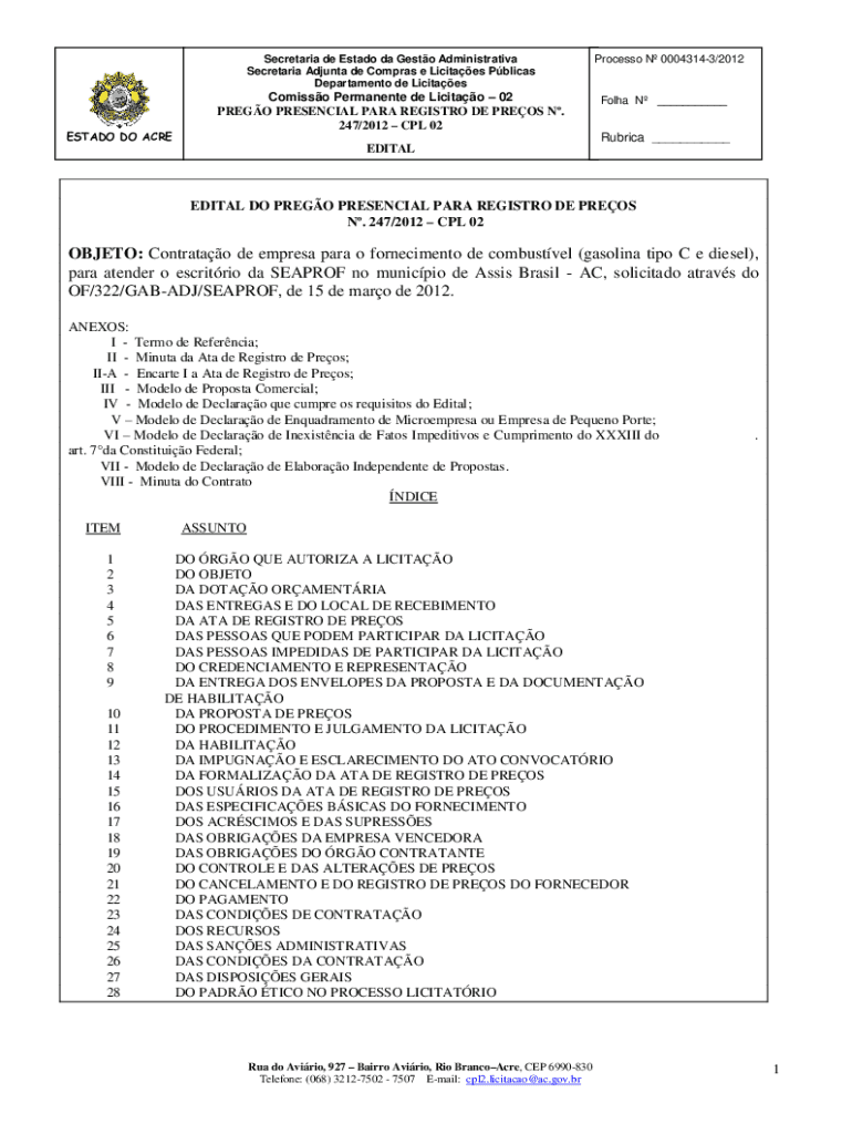 Secretariat de Estado the Gusto Administrative Secretariat Ad junta DE Cameras e Lucites Pelican Department de LicitaesESTADO DO ACREComisso Permanent de Licitao 02 PRESO PRESENCE PARA REGISTRY DE