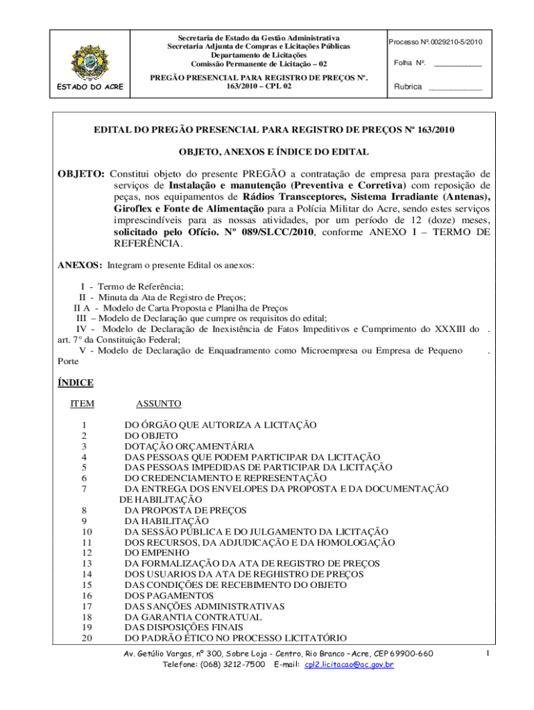 Obtenha o gratuito OBJETO: Constitui objeto do presente PREGO a contratao de empresa para prestao de