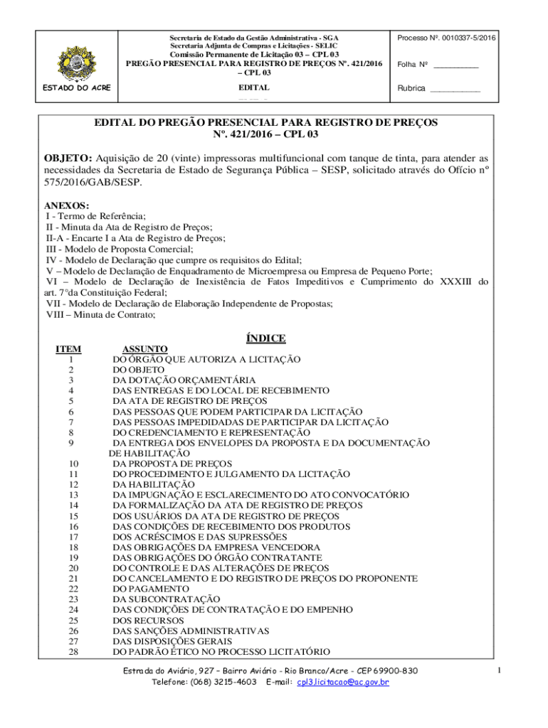 Secretariat de Estado the Gusto Administrative SGA Secretariat Ad junta DE Cameras e Lucites SELICESTADO DO Reprocess N. 00103375/2016Comisso Permanent de Licitao 03 CPL 03 PRESO PRESENCE PARA REGISTRY