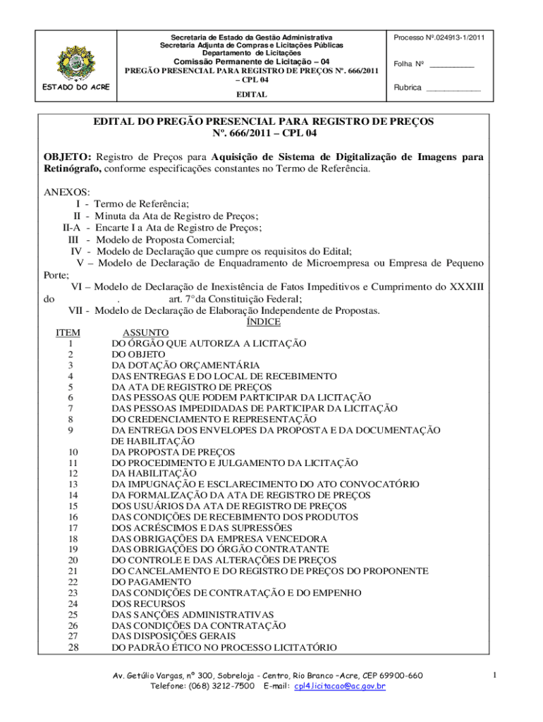 Secretariat de Estado the Gusto Administrative Secretariat Ad junta DE Cameras e Lucites Pelican Department de LicitaesESTADO DO ACREComisso Permanent de Licitao 04 PRESO PRESENCE PARA REGISTRY DE