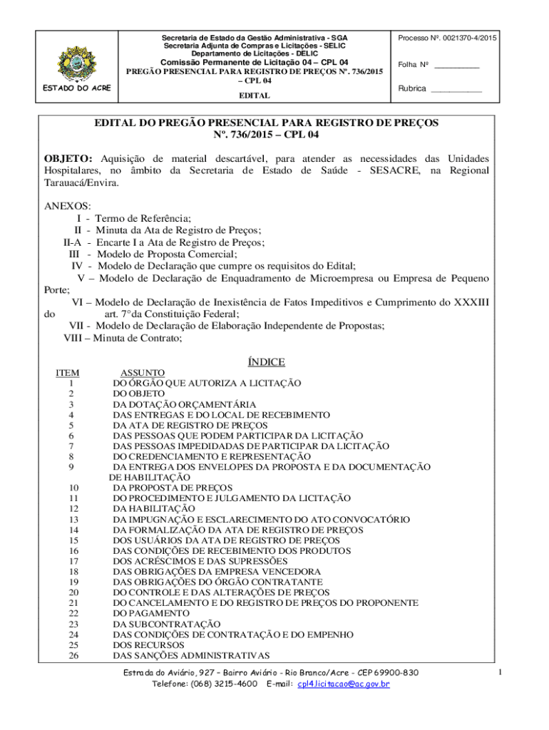 Secretariat de Estado the Gusto Administrative SGA Secretariat Ad junta DE Cameras e Lucites RELIC Department de Licitaes DELICESTADO DO ACREComisso Permanent de Licitao 04 CPL 04 PRESO PRESENCE PARA