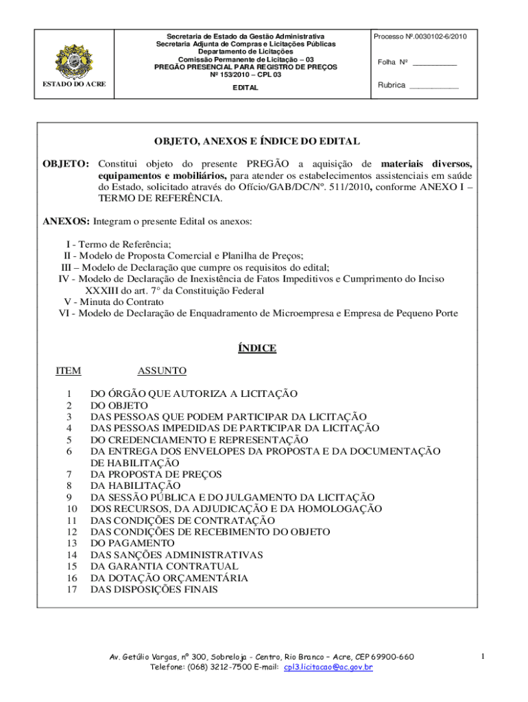 Obtenha o gratuito OBJETO: Constitui objeto do presente PREGO a aquisio de materiais diversos,