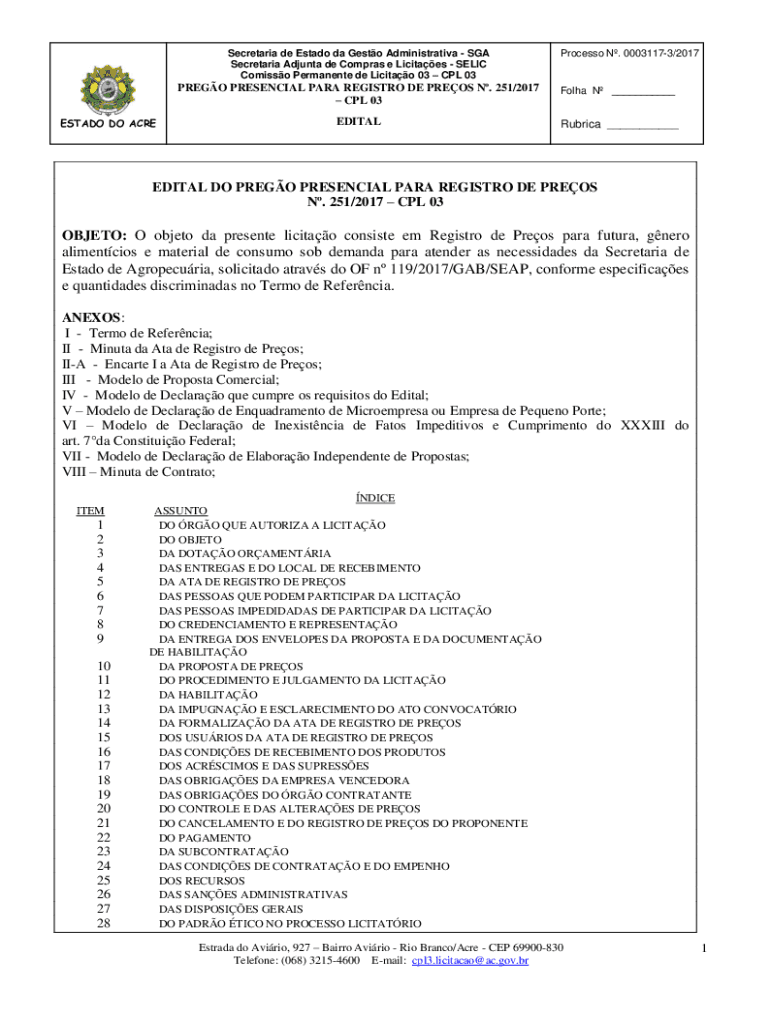 Comics Permanent de Licitao 03 CPL 03ESTADO DO Reprocess N. 00031173/2017PREGO PRESENCE PARA REGISTRY