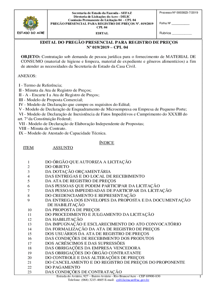 Secretariat de Estado the Agenda SE FAZ Directorial DE Lucites do Acre DISC Comics Permanent de Licitao 04 CPL 04 PRESO PRESENCE PARA REGISTRY DE PRESS N. 019/2019 CPL 04 ESTATE DO ACREEDITALProcesso