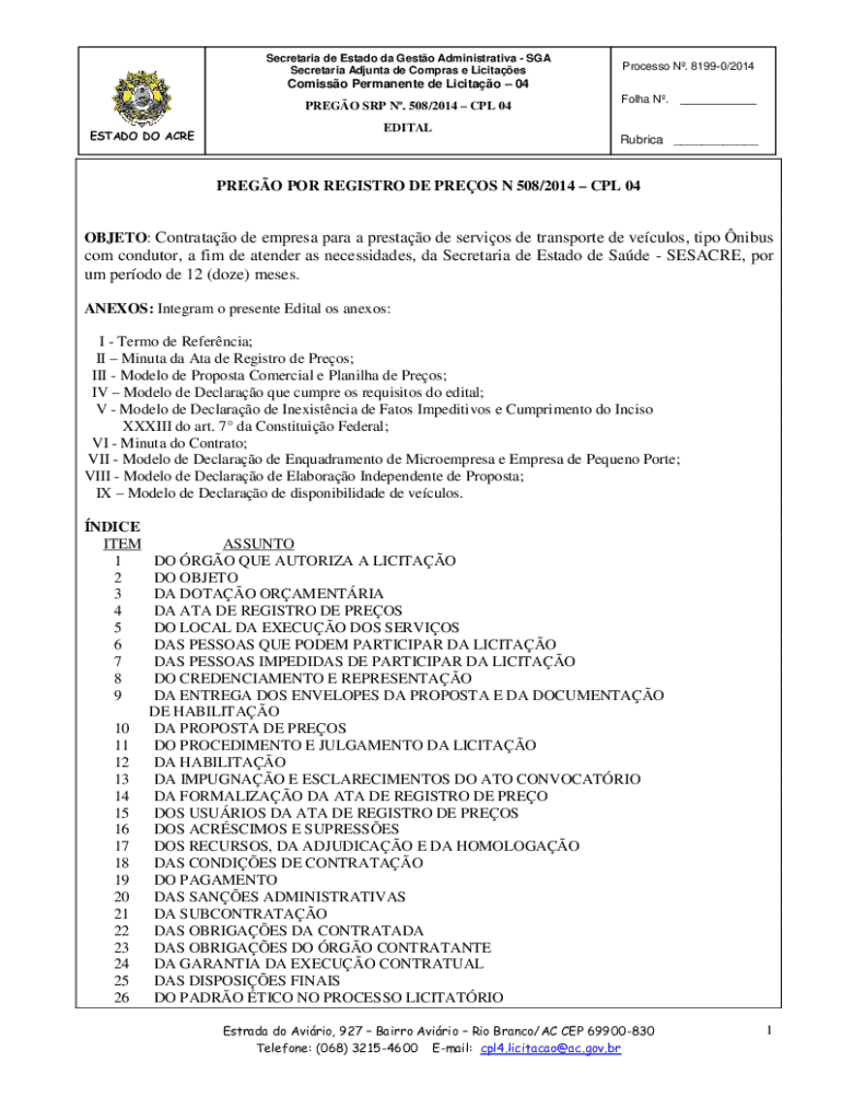 Secretariat de Estado the Gusto Administrative SGA Secretariat Ad junta DE Cameras e LicitaesProcesso N. 81990/2014Comisso Permanent de Licitao 04 PRESO SRP N. 508/2014 CPL 04 ESTATE DO Areola N.___EDIT