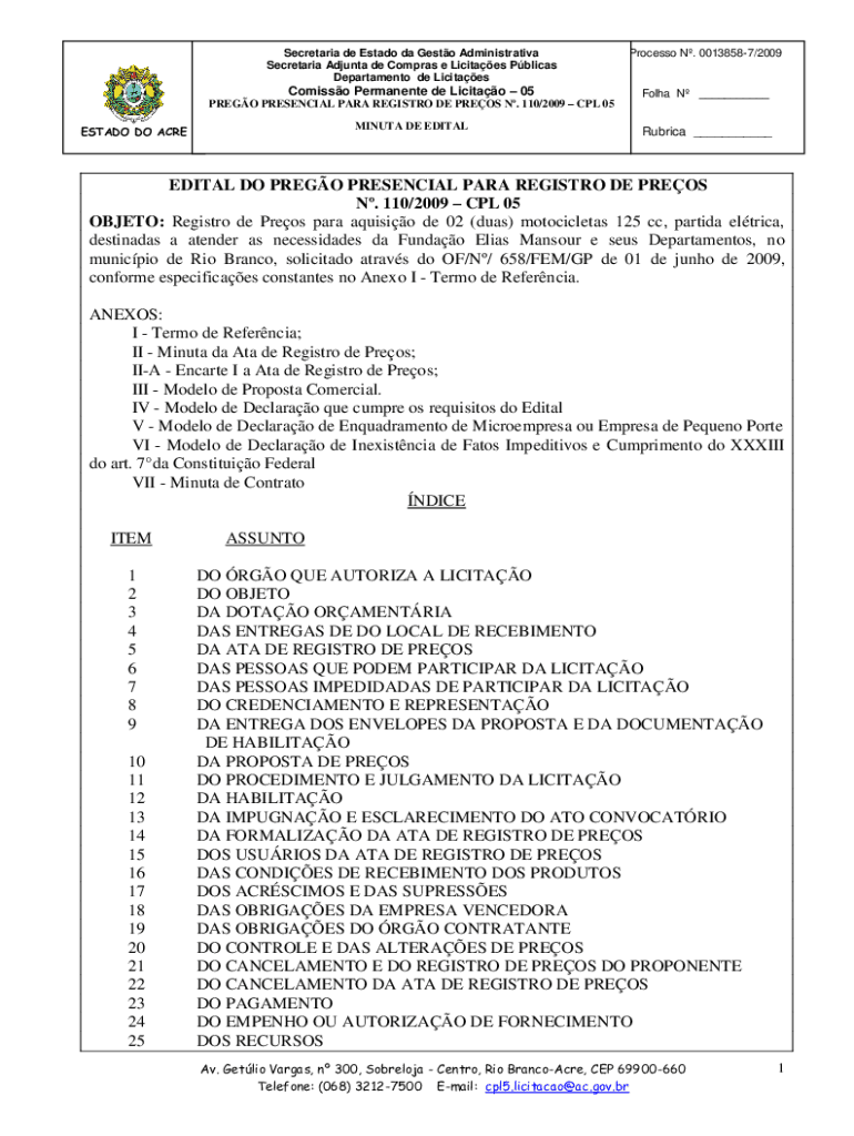Obtenha o gratuito OBJETO, ANEXOS E NDICE DO EDITAL OBJETO - Licitaes