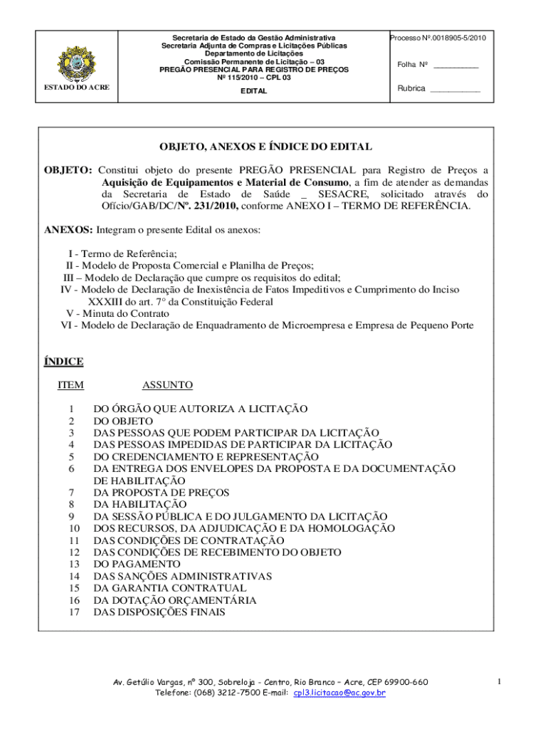 Obtenha o gratuito OBJETO: Constitui objeto do presente PREGO PRESENCIAL para Registro de Preos a