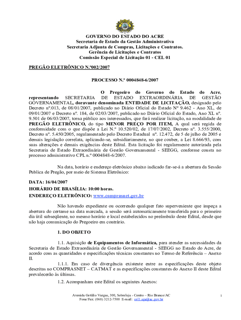 Obtenha o gratuito O Pregoeiro do Governo do Estado do Acre,