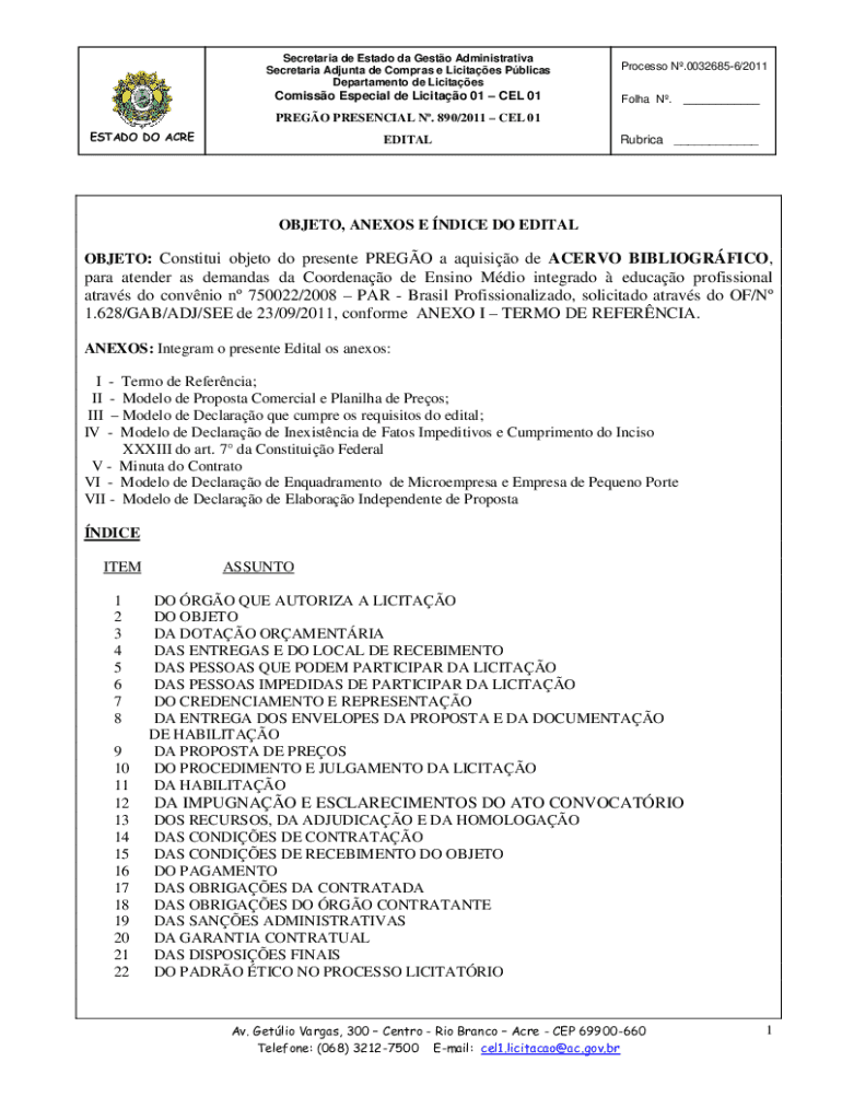 Obtenha o gratuito OBJETO: Constitui objeto do presente PREGO a aquisio de ACERVO BIBLIOGRFICO,