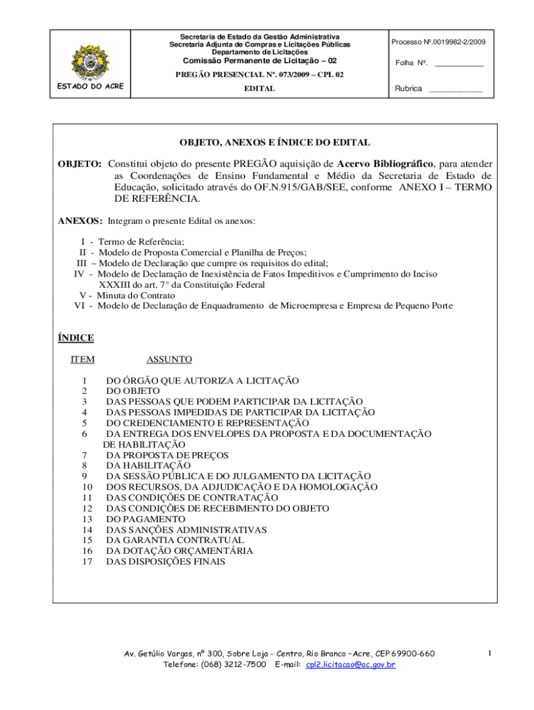 Obtenha o gratuito OBJETO: Constitui objeto do presente PREGO aquisio de Acervo Bibliogrfico, par...