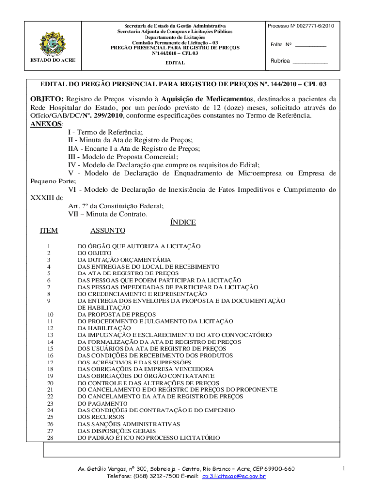 Secretariat de Estado the Gusto Administrative Secretariat Ad junta DE Cameras e Lucites Pelican Department de Licitaes Comics Permanent de Licitao 03 PRESO PRESENCE PARA REGISTRY DE PRESS N144/2010