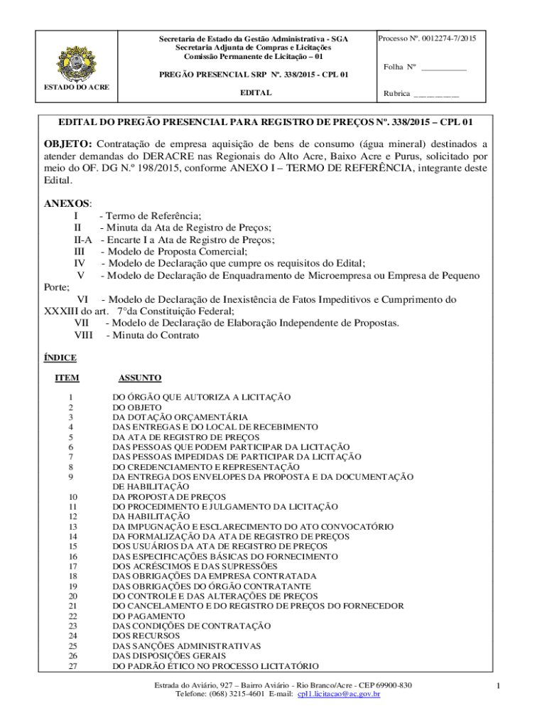 Obtenha o gratuito OBJETO: Contratao de empresa aquisio de bens de consumo (gua mineral) destinad...