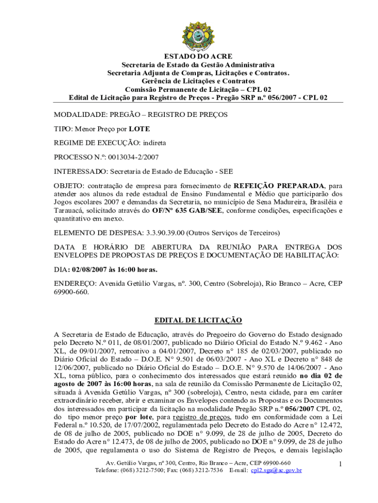 ESTATE DO ACRE Secretariat de Estado the Gusto Administrative Secretariat Ad junta DE Cameras, Lucites e Contraltos. Garcia de Licitaes e Contraltos Comics Permanent de Licitao CPL 02 Edital de Licitao