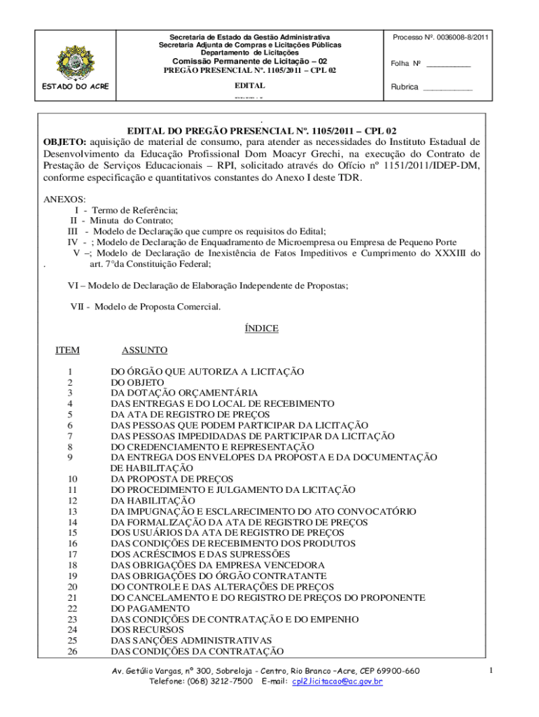 Obtenha o gratuito OBJETO: aquisio de material de consumo, para atender as necessidades do Instit...