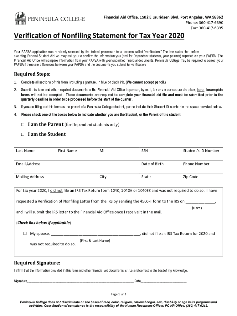 Financial Aid Office, 1502 E Lauren Blvd, Port Angeles, WA 98362 Phone: 3604176390 Fax: 3604176395Verification of Nonfiling Statement for Tax Year 2020Your FAFSA application was randomly selected