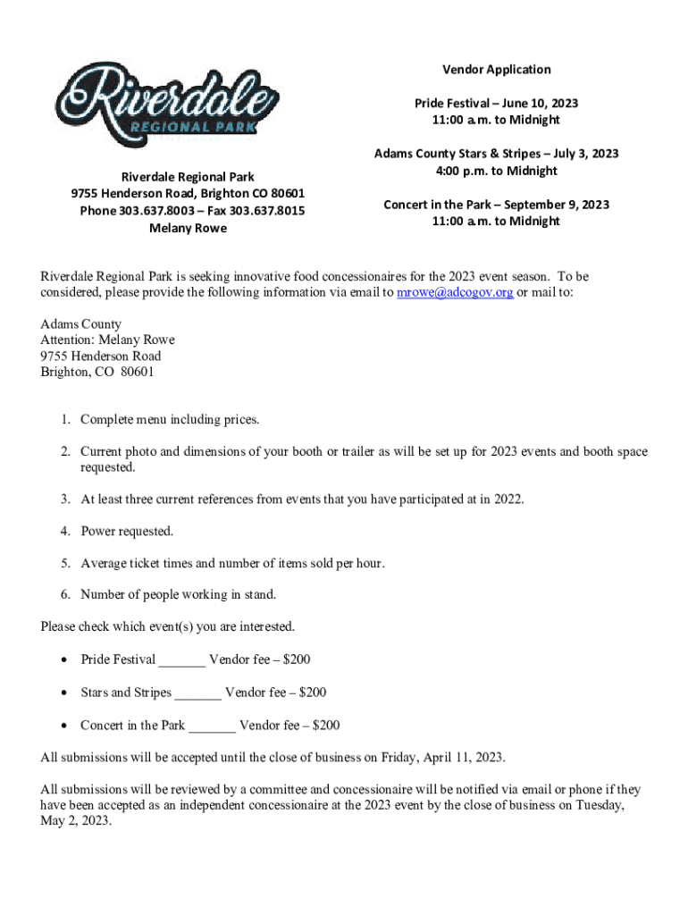 Vendor Application Pride Festival June 10, 2023 11:00 a.m. to MidnightRiverdale Regional Park 9755 Henderson Road, Brighton CO 80601 Phone 303.637.8003 Fax 303.637.8015 Meany Rowe Adams County Stars
