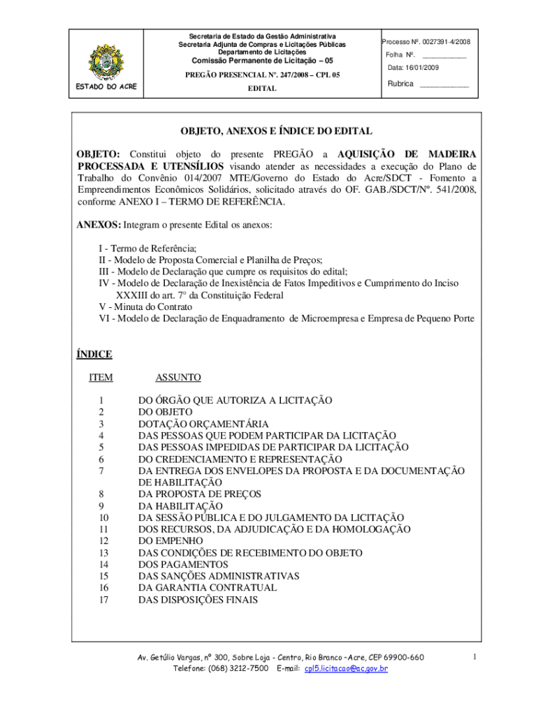 Secretariat de Estado the Gusto Administrative Secretariat Ad junta DE Cameras e Lucites Pelican Department de LicitaesComisso Permanent de Licitao 05Processo N. 00273914/2008 Fol ha N.___Data: 16/01/2009PREGO