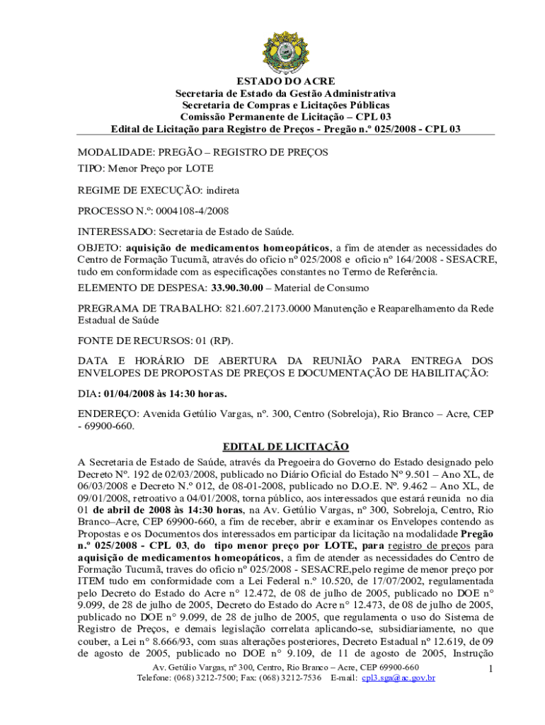 ESTATE DO ACRE Secretariat de Estado the Gusto Administrative Secretariat de Compras e Lucites Pelican Comics Permanent de Licitao CPL 03 Edital de Licitao para Registry de Preos PRESO n. 025/2008