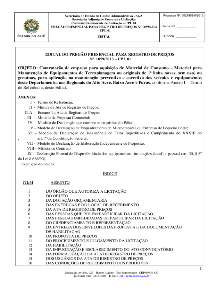 Secretariat de Estado the Gusto Administrative SGA Secretariat Ad junta DE Cameras e Lucites Comics Permanent de Licitao CPL 01 PRESO PRESENCE PARA REGISTRY DE PRESS N 1059/2013 CPL 01 ESTATE DO ACREEDITALProcesso