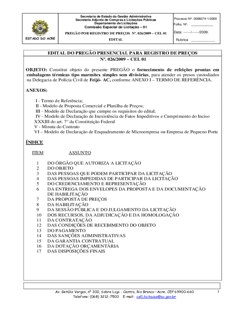 Secretariat de Estado the Gusto Administrative Secretariat Ad junta DE Cameras e Lucites Pelican Department de LicitaesComisso Especial DE Licit 01 PRESO POR REGISTRY DE PRESS N. 026/2009 CEL 01 ESTATE