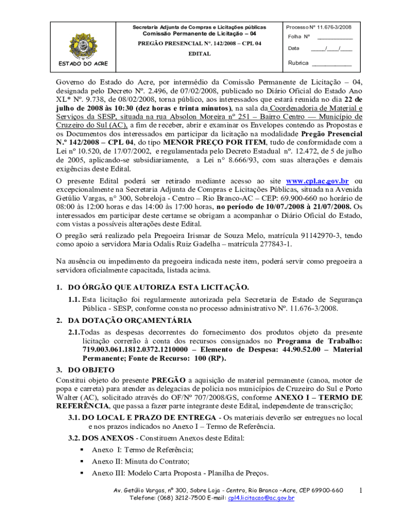 EDITALSecretaria Ad junta DE Cameras e Lucites pblicasComisso Permanent de Licitao 04 PRESO PRESENCE N. 142/2008 CPL 04 EDITALProcesso N 11.6763/2008 Fol ha N Data___ ___/___/___Rubric ___ESTATE DO